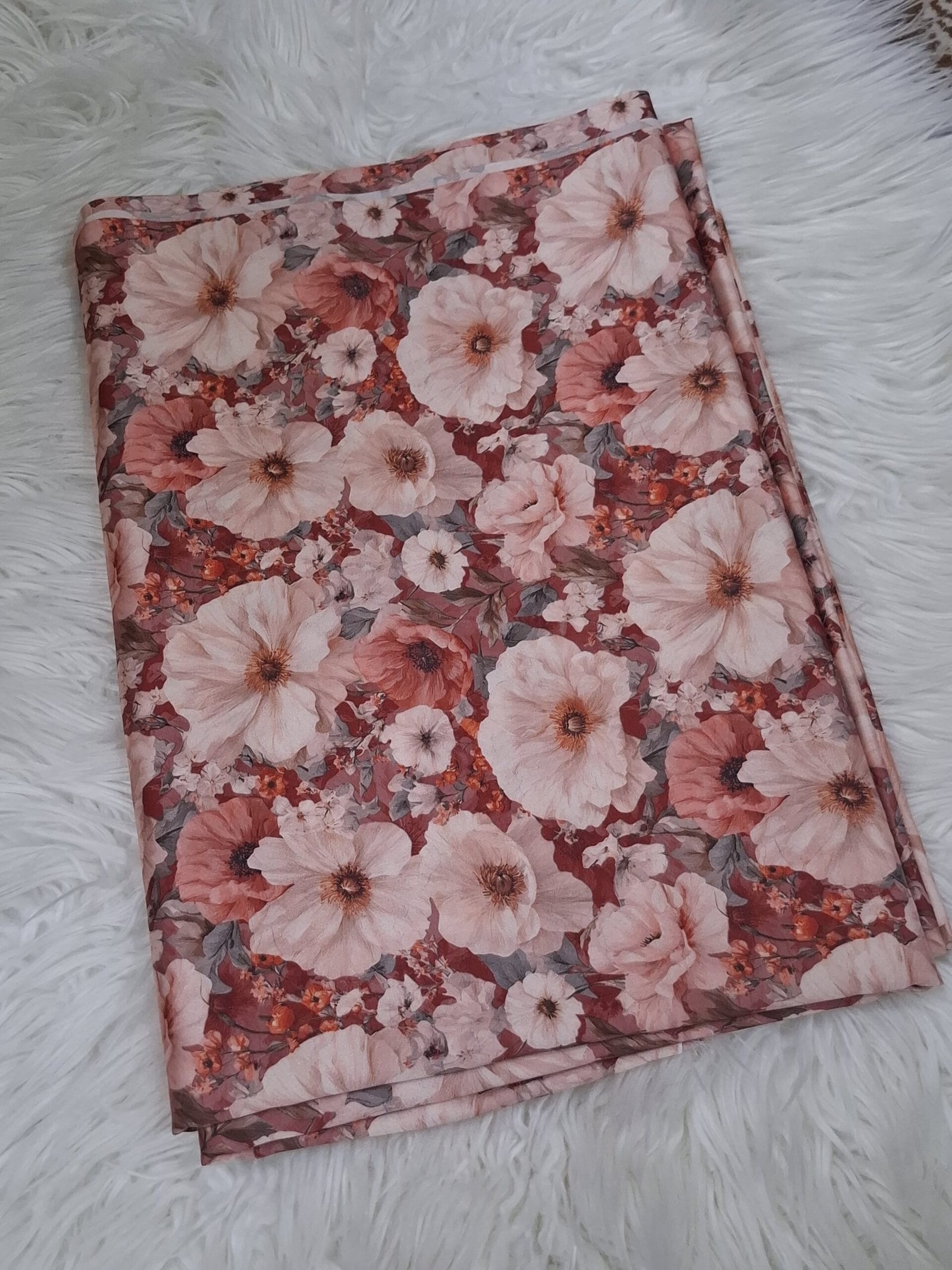 This premium Italian silk fabric features a smooth, flowing texture with a subtle, sophisticated sheen that reflects the quality and authenticity of the material. The classic floral pattern adds a timeless, graceful touch, making it perfect for statement pieces and special occasions.