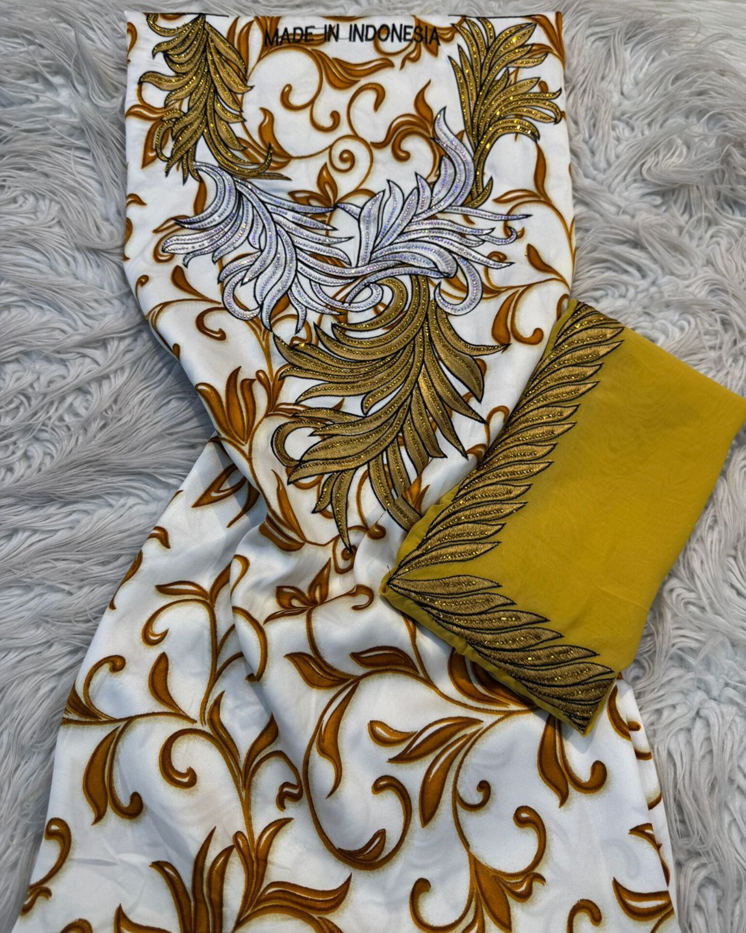 مخاوير راقية مصنوعة من الحرير الإندونيسي الأصلي، تتميّز بنعومة فائقة وانسيابية أنيقة. يزيّن المخوار تطريز متقن مستوحى من نقوش تراثية راقية، منفّذ بخيوط عالية الجودة ومكمّل بفصوص رقم 6 تضيف بريقًا متوازنًا يعكس فخامة هادئة.