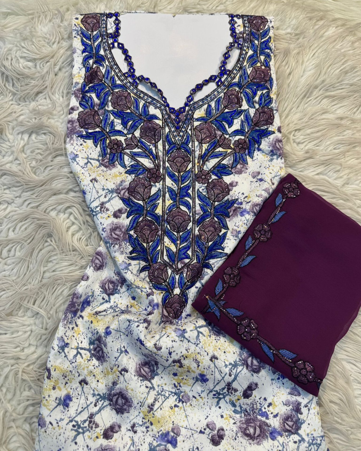 يأتي المخوار مرفقًا بشيلة شيفون بطول 2 يارد، مصمّمة بنفس ديزاين المخوار لتمنح إطلالة متكاملة بانسجام أنيق.