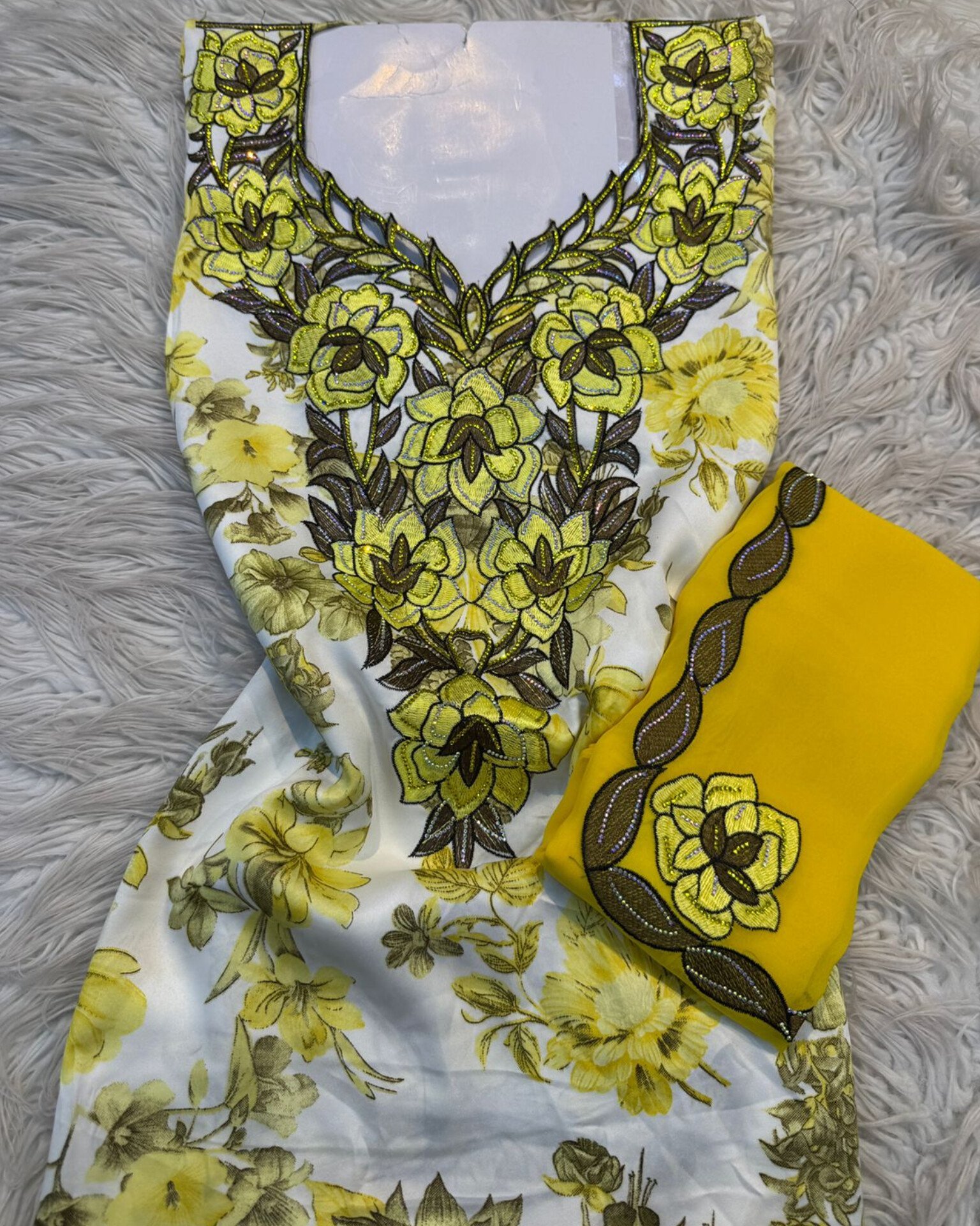 يأتي المخوار مرفقًا بشيلة شيفون بطول 2 يارد، مصمّمة بنفس ديزاين المخوار لتمنح إطلالة متكاملة بانسجام أنيق.