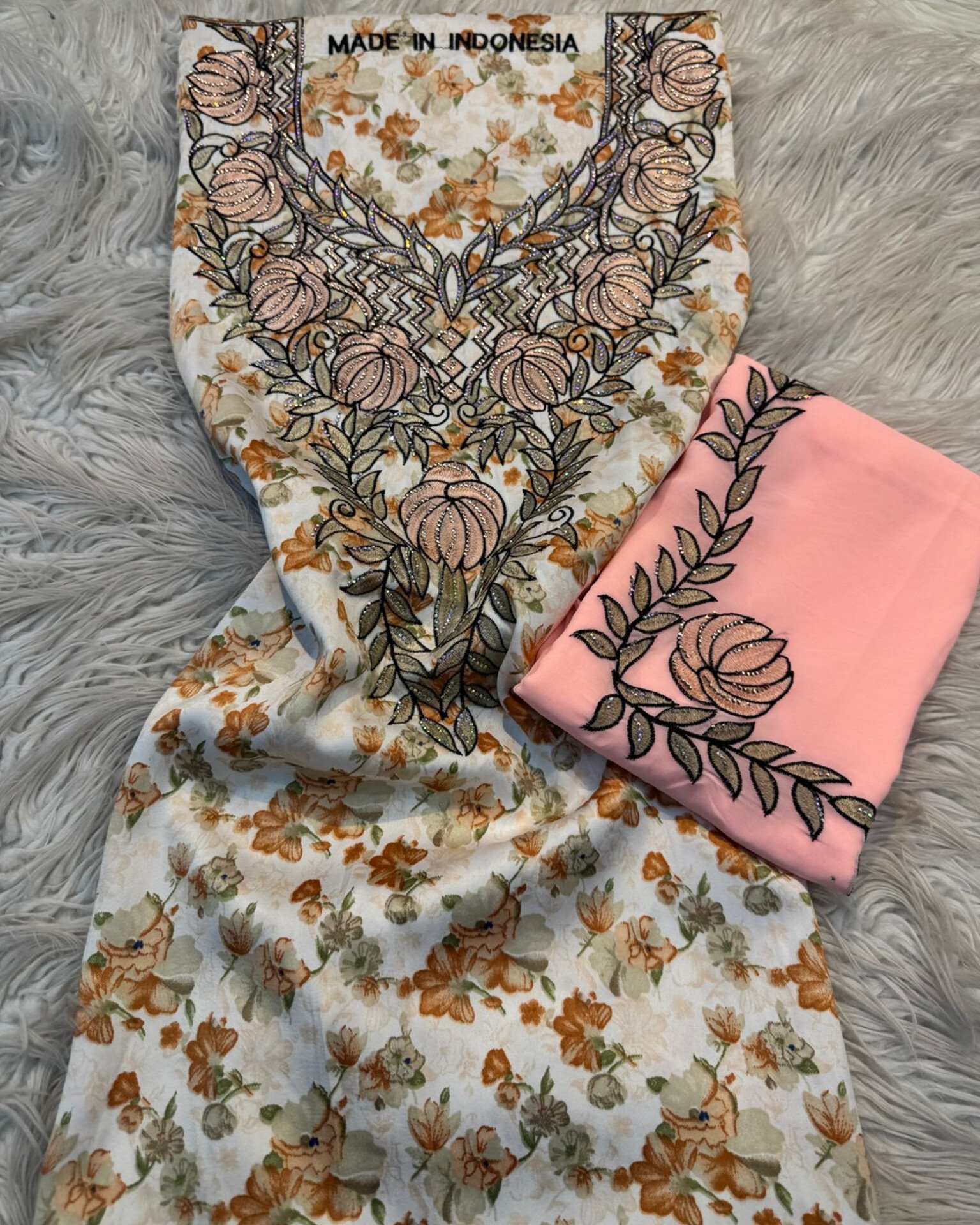 A refined mukhawar crafted from authentic Indonesian silk, known for its exceptional softness and elegant drape. The design features intricate embroidery inspired by timeless heritage motifs, enhanced with size-6 crystal embellishments for a subtle, sophisticated shimmer.