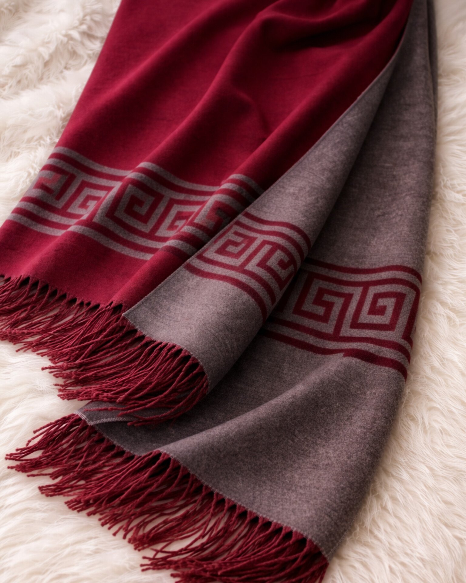 شال أنيق مصنوع من خامة كشمير ناعمة ودافئة، يتميز بتصميم ثنائي اللون يمنحك مرونة في التنسيق وإطلالتين في قطعة واحدة.